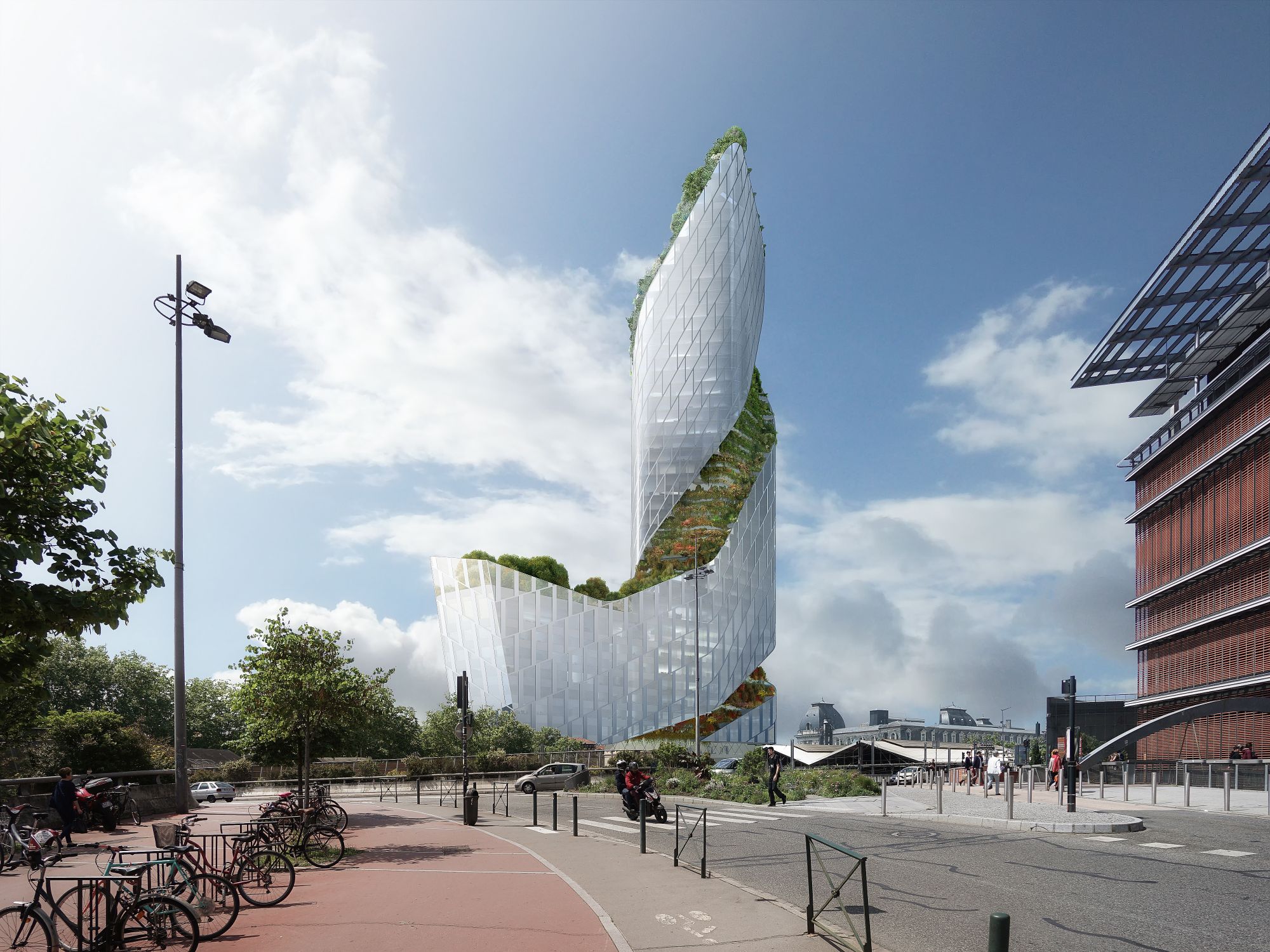 Un bâtiment-ville à la programmation mixte : tertiaire, logements, commerces, hôtellerie. La synergie des éléments programmatiques et l’énergie de récupération couvrent la majeure partie des besoins énergétiques, le végétal est utilisé pour sa capacité à rafraichir, à protéger et à limiter l’imperméabilisation.