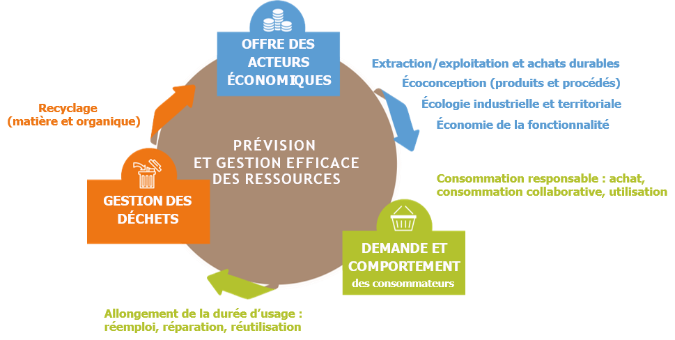 The areas and pillars of the circular economy. Adapted from "The circular economy. 3 areas, 7 pillars ", by ADEME
