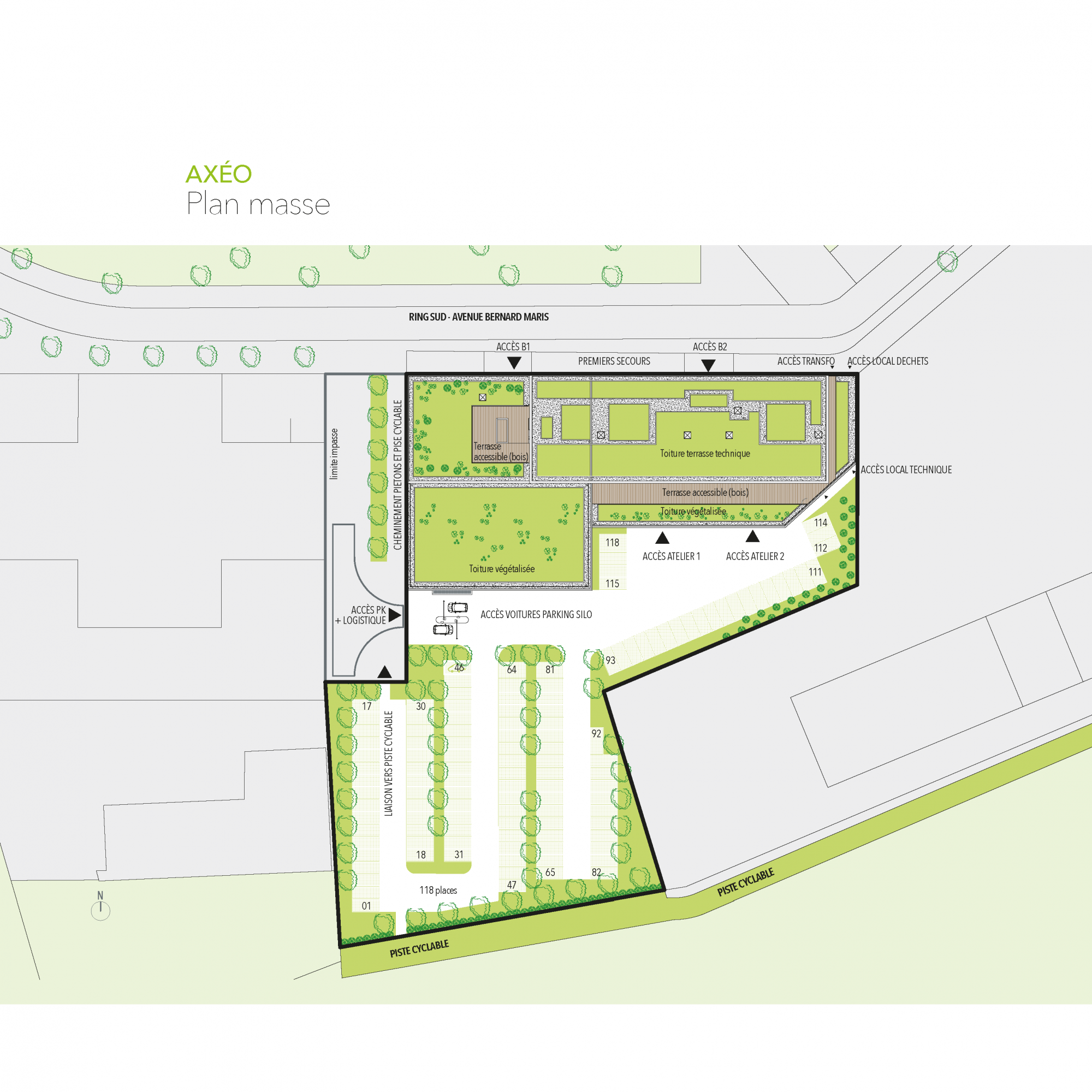 Il comprend un bâtiment R+9 avec bureaux sur 8 niveaux au-dessus d’ateliers au RDC. Un parking Silo est inclus dans le socle du bâtiment. Il se développe sur 7 niveaux en superstructure. Le projet prévoit aussi l’aménagement d’un parking paysager à l’air libre pour 120 places de stationnements.